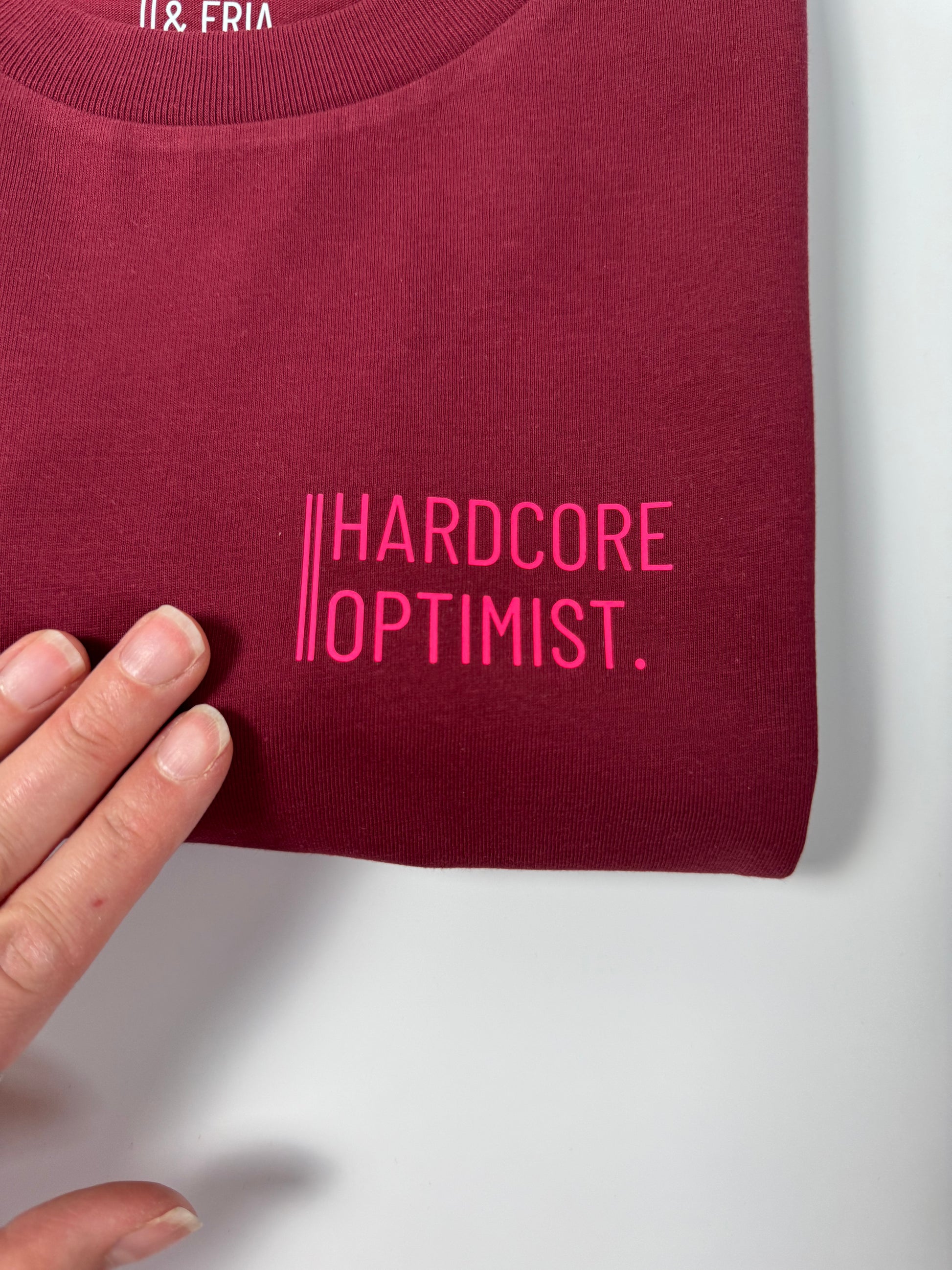 T-Shirt, Frauen, ‚Hardcore Optimist.‘, Burgundy / Neon Pink